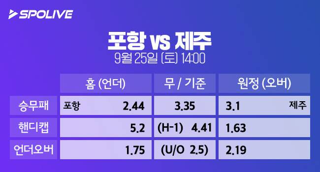 한편 이 경기는 득점 총합이 2.5골 이하로 흘러갈 가능성이 높다. 스포라이브는 양팀 득점 총합이 2.5골 이하에 1.75배, 2.5골 이상에 2.19배의 배당률을 책정했다. 따라서 스포라이브가 제공한 배당률을 고려할 때, 포항의 1-0 신승이 예상된다.