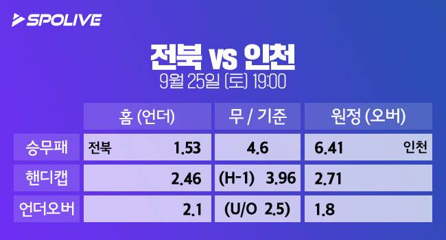 또한, 이번 경기는 다득점 경기가 될 것으로 예상한다. 스포라이브는 양 팀 득점의 총합이 2.5골 이하일 것이라는 배당에 2.1배를, 2.5골 이상에는 1.8배의 배당률을 책정했다. 배당률과 함께 양 팀의 현재 분위기를 고려해 봤을 때, 전북이 2-1 승리를 거두며 인천을 파이널B로 보낼 것으로 예상한다.