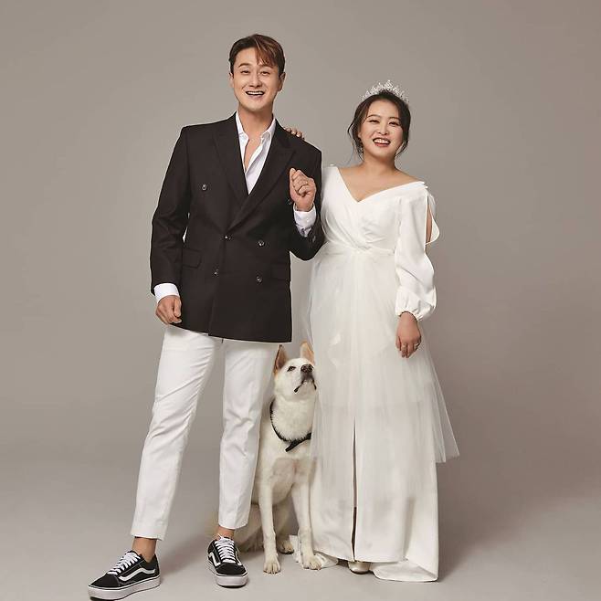 공개된 사진 속에는 결혼 10주년을 맞이해 기념 사진을 찍은 두 사람과 반려견 태풍이의 모습이 담겼다.