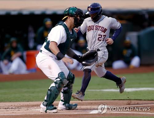 epa09486749 Houston Astros Jose Altuve (R) scores on Houston Astros Yuli Gurriel's sacrifice-fly while beating the tag by Oakland Athletics catcher Yan Gomes (L) during the first inning of the Major League Baseball (MLB) game between the Houston Astros and the Oakland Athletics at RingCentral Coliseum in Oakland, California, USA, 24 September 2021. EPA/JOHN G. MABANGLO
