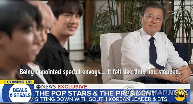 BTS 멤버 정국은 이날 방영된 ABC뉴스와의 인터뷰에서 "특사 임명장을 받고 대통령과 함께 뉴욕에서 뉴스를 하고 있다는 게 약간 시간이 멈췄다는 느낌을 받았다"며 이같이 말했다.