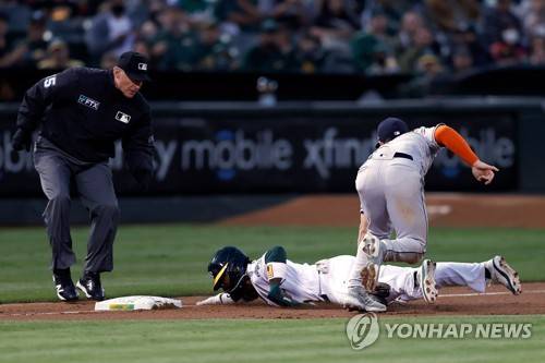 epaselect epa09486747 Oakland Athletics Josh Harrison (C) gets tagged-out by Houston Astros third baseman Alex Bregman (R) during the first inning of the Major League Baseball (MLB) game between the Houston Astros and the Oakland Athletics at RingCentral Coliseum in Oakland, California, USA, 24 September 2021. EPA/JOHN G. MABANGLO