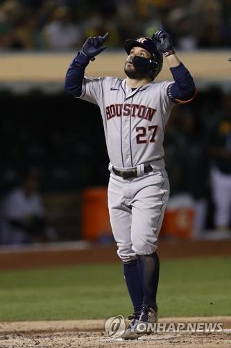 epa09486756 Houston Astros Jose Altuve points skywards while crossing home plate after hitting a solo home run off Oakland Athletics starting pitcher Frankie Montas during the third inning of the Major League Baseball (MLB) game between the Houston Astros and the Oakland Athletics at RingCentral Coliseum in Oakland, California, USA, 24 September 2021. EPA/JOHN G. MABANGLO