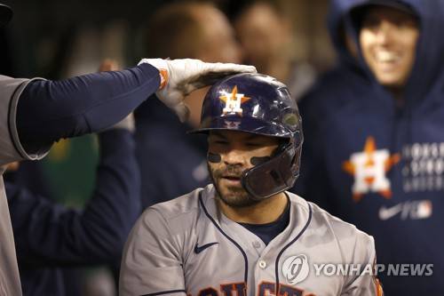 epa09486766 Houston Astros Jose Altuve is greeted by teammates after hitting a solo home run off Oakland Athletics starting pitcher Frankie Montas during the third inning of the Major League Baseball (MLB) game between the Houston Astros and the Oakland Athletics at RingCentral Coliseum in Oakland, California, USA, 24 September 2021. EPA/JOHN G. MABANGLO