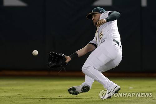 epa09486806 Oakland Athletics right fielder Seth Brown makes a sliding catch off Houston Astros Alex Bregman fly-out during the fifth inning of the Major League Baseball (MLB) game between the Houston Astros and the Oakland Athletics at RingCentral Coliseum in Oakland, California, USA, 24 September 2021. EPA/JOHN G. MABANGLO
