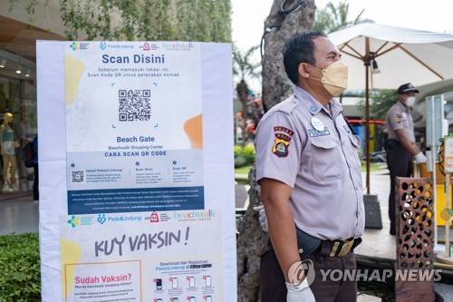epa09486848 A sign recommends the use of PeduliLindungi App at an entrance of a shopping mall in Kuta, Bali, Indonesia, 25 September 2021. PeduliLindungi is a COVID-19 surveillance app aimed to curb the spread of COVID-19. The application has implemented in several bussines and tourist area in Bali as a preparation to reopen Bali for international tourist. EPA/MADE NAGI