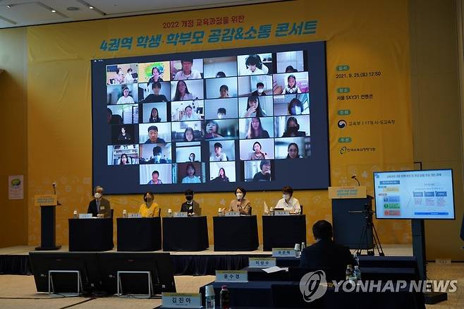 (서울=연합뉴스) 유은혜 부총리 겸 교육부 장관이 25일 서울 SKY31 컨벤션에서 열린 2022 개정 교육과정 학생·학부모 간담회에서 발언하고 있다. 2021.9.25