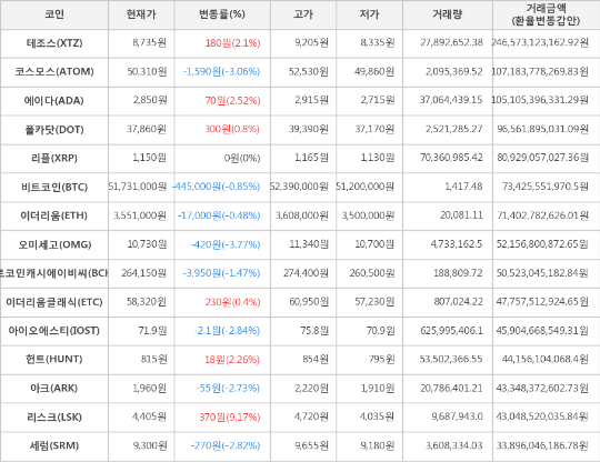 한편 거래금액 기준으로는 테조스, 코스모스, 에이다 순으로 가장 활발한 거래를 보이고 있다.