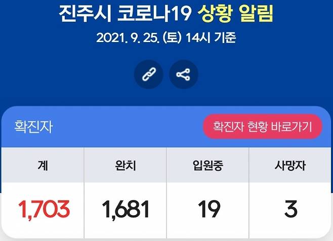 25일 현재 진주시 누적 확진자는 1703명이고, 완치자는 1681명이며, 19명은 입원, 자가격리자는 214명이다.