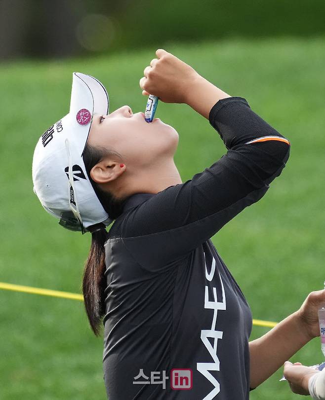 [이데일리 골프in(안산)=조원범 기자]25일 경기도 안산시 대부도에 위치한 아일랜드CC(파72.6613야드)에서 '엘크루-TV조선 프로 셀러브리티 2021'(총상금6억원,우승상금1억8백만원)2라운드가 열렸다.손연정이 1번홀에서 옥타미녹스를 먹고 있다.