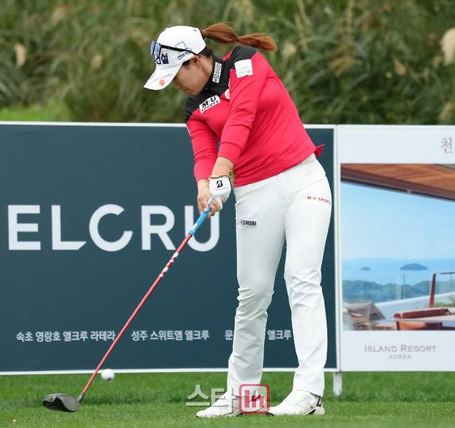 [이데일리 골프in(안산)=조원범 기자]25일 경기도 안산시 대부도에 위치한 아일랜드CC(파72.6613야드)에서 '엘크루-TV조선 프로 셀러브리티 2021'(총상금6억원,우승상금1억8백만원)2라운드가 열렸다.지한솔이 1번홀에서 경기를 하고 있다.