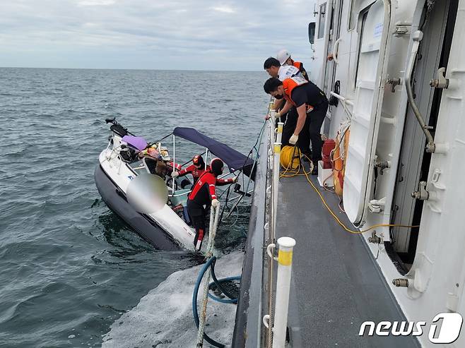 (인천=뉴스1) 박아론 기자 = 25일 자월도 해상에서 침수되고 있는 레저보트 승선원 4명을 구조하고 있는 해경(인천해양경찰서 제공)2021.9.25/뉴스1