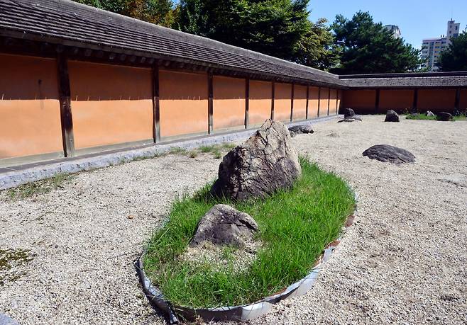 The Japanese garden resembles the dry landscape garden at Ryoanji Temple in Kyoto. The dry landscape garden refers to those that emphasize the beauty of negative space through a random composition of rocks.