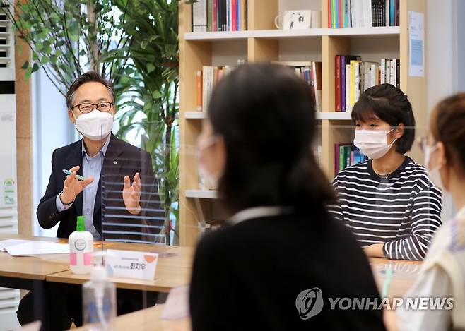 (서울=연합뉴스) 유성훈 금천구청장(왼쪽)이 25일 서울 금천구 청춘빌딩에서 열린 청소년총선거 당선자 간담회에서 청소년의회 의원들과 이야기를 나누고 있다. 2021.9.25