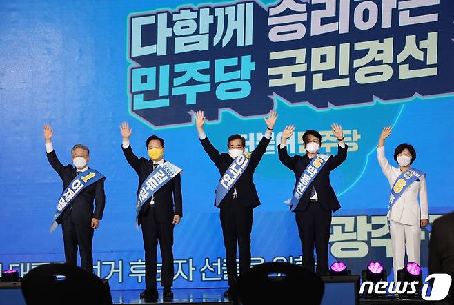 (광주=뉴스1) 박준배 기자 = 더불어민주당 대선 경선 후보들이 25일 광주 김대중컨벤션센터에서 열린 '광주전남 합동연설회'에 참석해 정견발표 전 손을 흔들며 포토타임을 갖고 있다.2021.9.25/뉴스1