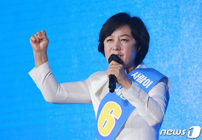 (광주=뉴스1) 구윤성 기자 = 추미애 더불어민주당 대선 예비후보가 25일 광주 서구 김대중컨벤션센터에서 열린 더불어민주당 대선 후보 선출을 위한 광주·전남 합동연설회에서 정견발표를 하고 있다. 2021.9.25/뉴스1