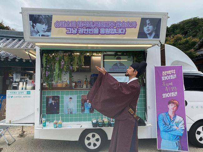 사진 속 권현빈은 방탄소년단 진, 유승호가 선물한 커피차 앞에서 천진난만한 미소를 짓고 있는 모습. '슈퍼스타 김석진, 국민배우 유승호가 그냥 권현빈을 응원합니다'라는 재치있는 문구가 눈길을 끈다.