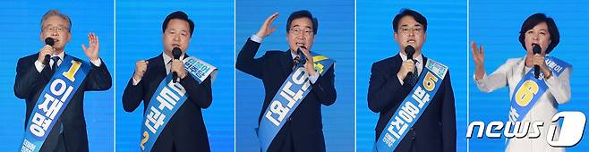 (광주=뉴스1) 구윤성 기자 = 더불어민주당 대선 예비후보들이 25일 광주 서구 김대중컨벤션센터에서 열린 더불어민주당 대선 후보 선출을 위한 광주·전남 합동연설회에서 정견발표를 하고 있다. 왼쪽부터 이재명, 김두관, 이낙연, 박용진, 추미애 후보. 2021.9.25/뉴스1
