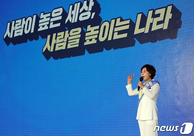 (광주=뉴스1) 박준배 기자 = 추미애 더불어민주당 대선 경선 후보가 25일 광주 김대중컨벤션센터에서 열린 '광주전남 합동연설회'에서 정견발표를 하고 있다.2021.9.25/뉴스1
