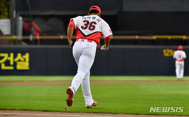 [광주=뉴시스] 신대희 기자 = 25일 오후 광주 북구 광주-기아챔피언스필드에서 열린 2021프로야구 KIA 타이거즈 대 SSG 랜더스의 경기, 1회초 시작 직전 KIA 선발투수 보 다카하시가 마운드로 향하고 있다. KIA 타이거즈 새 외국인 투수 다카하시(일본계 3세 브라질 국적)는 이날 KBO리그 데뷔전을 치렀다. 2021.09.25. sdhdream@newsis.com