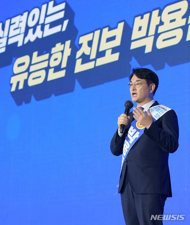 [광주=뉴시스] 류형근 기자 = 더불어민주당 대선 후보 선출을 위한 순회 경선 광주·전남 합동연설회가 25일 오후 광주 서구 김대중컨벤션센터 1층 다목적홀에서 열리고 있다. 기호 5번 박용진 후보가 연설을 하고 있다. 2021.09.25. hgryu77@newsis.com