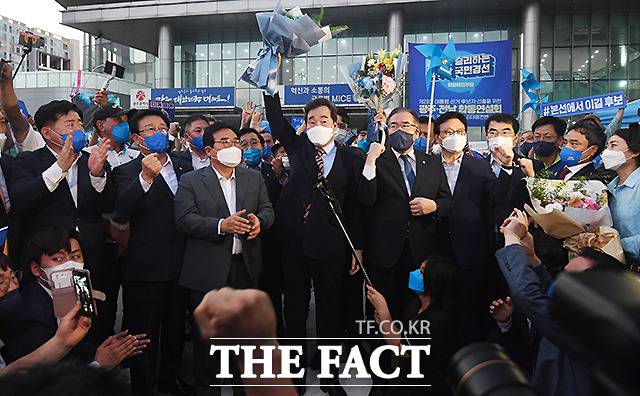 [더팩트ㅣ광주=이새롬 기자] 25일 오후 광주 서구 김대중컨벤션센터에서 더불어민주당 대선 후보 선출을 위한 광주·전남 합동연설회가 열린 가운데, 첫 승을 거둔 이낙연 후보가 지지자들에게 인사하고 있다.