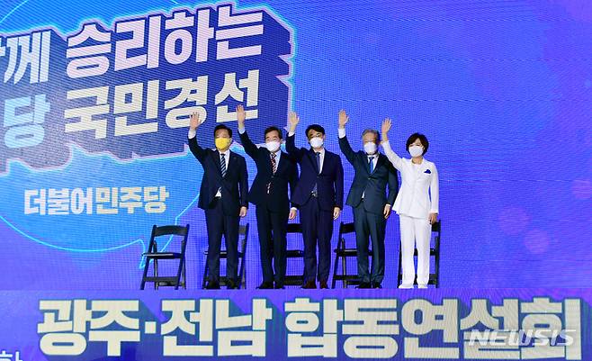 [광주=뉴시스] 류형근 기자 = 더불어민주당 대선 후보 선출을 위한 순회 경선 광주·전남 합동연설회가 25일 오후 광주 서구 김대중컨벤션센터 1층 다목적홀에서 열리고 있다. 후보들이 투표결과 발표를 기다리며 손인사를 하고 있다. 2021.09.25. hgryu77@newsis.com