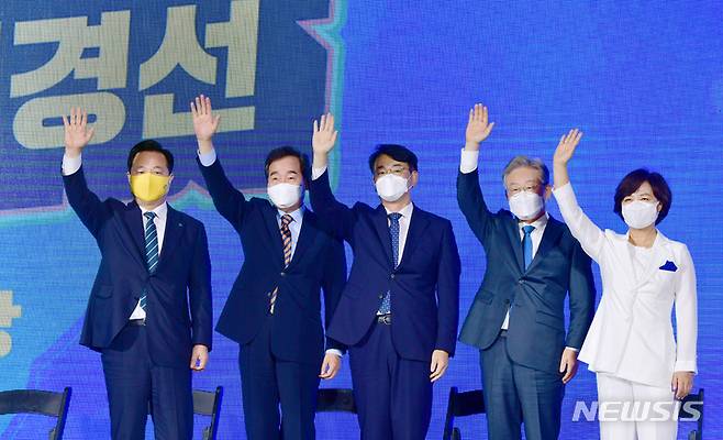 [광주=뉴시스] 류형근 기자 = 더불어민주당 대선 후보 선출을 위한 순회 경선 광주·전남 합동연설회가 25일 오후 광주 서구 김대중컨벤션센터 1층 다목적홀에서 열리고 있다. 후보들이 투표결과 발표를 기다리며 손인사를 하고 있다. 2021.09.25. hgryu77@newsis.com
