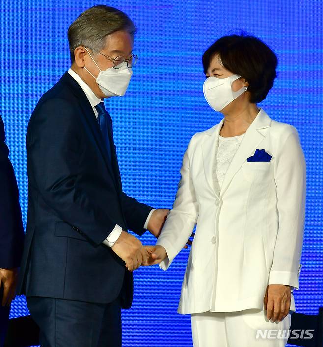 [광주=뉴시스] 류형근 기자 = 더불어민주당 대선 후보 선출을 위한 순회 경선 광주·전남 합동연설회가 25일 오후 광주 서구 김대중컨벤션센터 1층 다목적홀에서 열리고 있다. 투표결과 발표 뒤 이재명·추미애 후보가 악수를 하고 있다. 2021.09.25. hgryu77@newsis.com