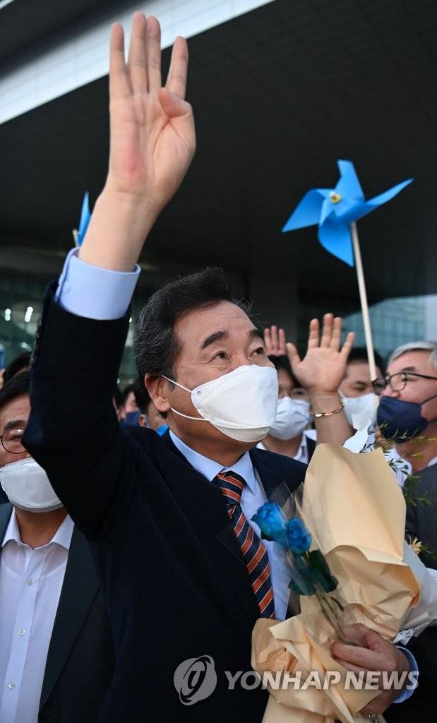 (광주=연합뉴스) 박철홍 기자 = 더불어민주당 대통령선거 후보자 선출을 위한 광주·전남 합동연설회가 열린 25일 오후 광주 서구 김대중컨벤션센터 앞에서 득표 결과 발표를 듣고 퇴장한 이낙연 후보가 지지자들을 만나 손흔들고 있다. 이날 광주·전남 경선에서는 이낙연 후보가 47.12%를 득표해 이재명 후보를 근소한 차이로 앞선 1위를 차지했다.2021.9.25 [공동취재]