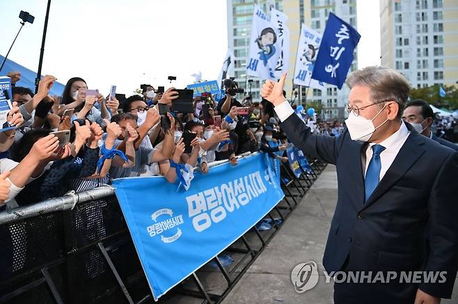 (광주=연합뉴스) 박철홍 기자 = 더불어민주당 대통령선거 후보자 선출을 위한 광주·전남 합동연설회가 열린 25일 오후 광주 서구 김대중컨벤션센터 앞에서 득표 결과 발표를 듣고 퇴장한 이재명 후보가 지지자들을 만나고 있다. 이날 광주·전남 경선에서는 이낙연 후보가 47.12%를 득표해 이재명 후보를 근소한 차이로 앞선 1위를 차지했다. 2021.9.25 [공동취재]