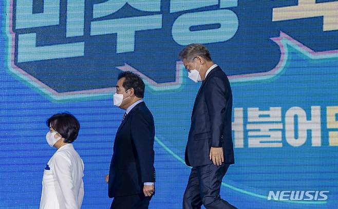 [광주=뉴시스] 류형근 기자 = 더불어민주당 대선 후보 선출을 위한 순회 경선 광주·전남 합동연설회가 25일 오후 광주 서구 김대중컨벤션센터 1층 다목적홀에서 열리고 있다. 이재명·이낙연·추미애 후보가 계단을 내려가고 있다. 2021.09.25. hgryu77@newsis.com