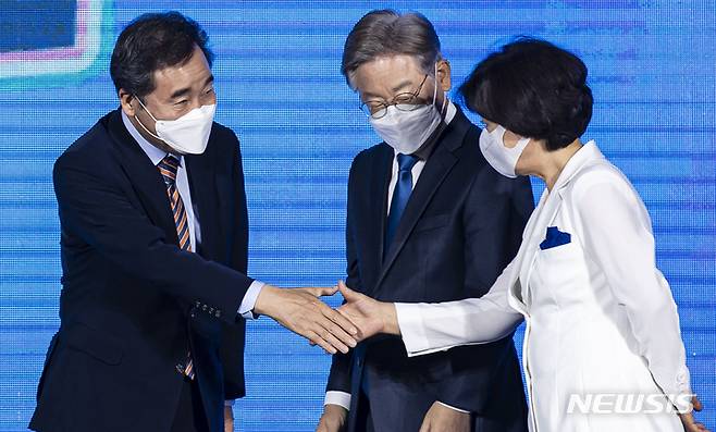 [광주=뉴시스] 류형근 기자 = 더불어민주당 대선 후보 선출을 위한 순회 경선 광주·전남 합동연설회가 25일 오후 광주 서구 김대중컨벤션센터 1층 다목적홀에서 열리고 있다. 투표결과 발표 뒤 이낙연·추미애 후보가 악수를 하고 있다. 2021.09.25. hgryu77@newsis.com