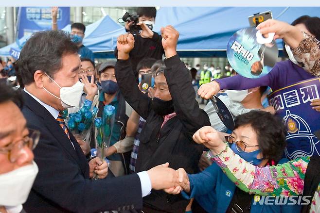 [광주=뉴시스] 류형근 기자 = 더불어민주당 대선 주자인 이낙연 후보가 25일 오후 광주 서구 김대중컨벤션센터에서 열린 대선 경선 광주·전남 합동연설회를 마친 뒤 지지자들에게 손인사를 하고 있다. 2021.09.25. hgryu77@newsis.com