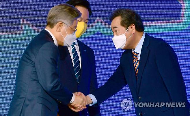 (광주=연합뉴스) 박철홍 기자 = 더불어민주당 대통령선거 후보자 선출을 위한 광주·전남 합동연설회가 열린 25일 오후 광주 서구 김대중컨벤션센터에서 득표 결과 발표 직후 이낙연(오른쪽) 후보와 이재명 후보가 인사 나누고 있다. 이날 광주·전남 경선에서는 이낙연 후보가 47.12%를 득표해 이재명 후보를 근소한 차이로 앞선 1위를 차지했다.2021.9.25 [공동취재]