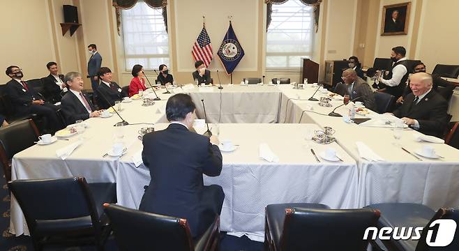 (서울=뉴스1) 오대일 기자 = 이준석 국민의힘 대표가 24일(현지시간) 워싱턴 국회의사당을 방문해 그레고리 믹스 하원 외교위원장을 면담하고 있다. (국민의힘 제공) 2021.9.25/뉴스1