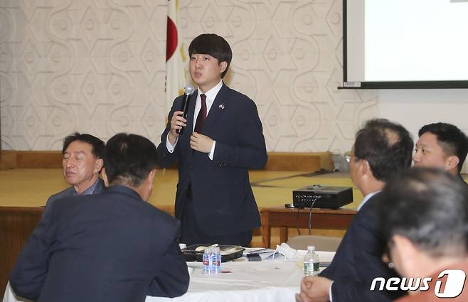 (서울=뉴스1) 오대일 기자 = 이준석 국민의힘 대표가 24일(현지시간) 뉴욕 한인봉사센터에서 열린 뉴욕 재외동포 정책간담회에서 발언하고 있다. (국민의힘 제공) 2021.9.25/뉴스1