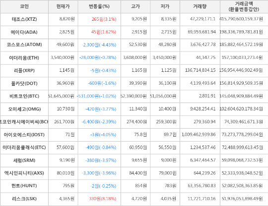 또한, 테조스(3.1%, 8,820원), 에이다(1.62%, 2,825원)가 상승세를 나타냈다.