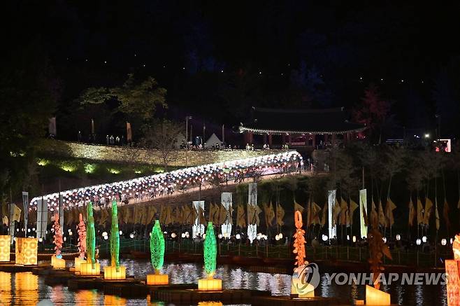 (공주=연합뉴스) 제67회 백제문화제 개막식이 25일 충남 공주시 금강 미르섬에서 열렸다. 사진은 금강을 수놓은 유등들 모습. 2021. 9.25 [공주시 제공. 재판매 및 DB 금지]