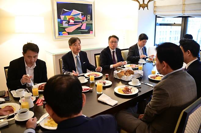 [서울=뉴시스] 전신 기자 = 송영길 더불어민주당 대표가 23일(현지시간) 롯데 뉴욕 팰리스호텔에서 조현 주유엔 대사와 조찬 간담회를 하고 있다. (사진= 더불어민주당 제공) 2021.09.25. photo@newsis.com *재판매 및 DB 금지