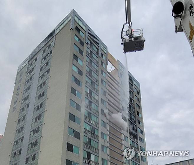 (창원=연합뉴스) 25일 오후 경남 창원시 마산회원구 합성동 한 주상복합아파트에서 불이 나 소방당국이 진화 작업을 벌이고 있다. 2021.9.25 [창원소방본부 제공. 재판매 및 DB 금지]