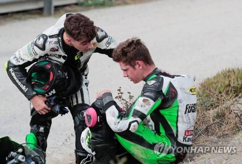 epa09487271 Australian SuperSport300 rider Harry Khouri (R), is comforted by other rider after a multiple accident happened during their Superbike World Championship's Motul Spanish Round race at Circuito de Jerez-Angel Nieto track in Jerez de la Frontera, Spain, 25 September 2021. EPA/Roman Rios