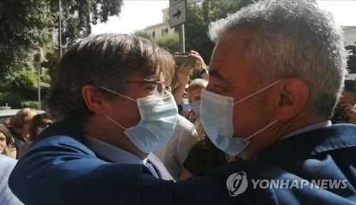 epa09487289 A frame grab made from a video shows Former Catalan regional premier Carles Puigdemont embraces the mayor of Alghero Mario Conoci, in Alghero, Sardinia, Italy, 25 September 2021. Catalan pro-independent leader and former regional President Carles Puigdemont was released from an arrest on Friday 24 September after he was arrested in the Italian island of Sardinia a day earlier in the evening, under a international warrant asked by Spanish authorities, four years after he run away from judicial authorities amid the inquiry of the illegal referendum held in Catalonia in 2017. EPA/GIANMARIO SIAS BEST QUALITY AVAILABLE