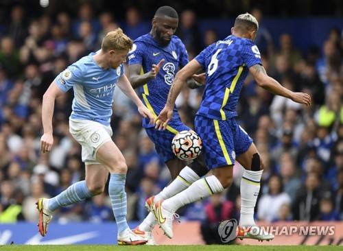 epa09487351 Kevin De Bruyne (L) of Manchester City in action against Thiago Silva (R) of Chelsea during the English Premier League soccer match between Chelsea FC and Manchester City in London, Britain, 25 September 2021. EPA/Facundo Arrizabalaga EDITORIAL USE ONLY. No use with unauthorized audio, video, data, fixture lists, club/league logos or 'live' services. Online in-match use limited to 120 images, no video emulation. No use in betting, games or single club/league/player publications
