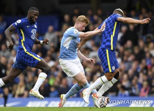 epa09487367 Kevin De Bruyne (C) of Manchester City in action against Thiago Silva (R) of Chelsea during the English Premier League soccer match between Chelsea FC and Manchester City in London, Britain, 25 September 2021. EPA/Facundo Arrizabalaga EDITORIAL USE ONLY. No use with unauthorized audio, video, data, fixture lists, club/league logos or 'live' services. Online in-match use limited to 120 images, no video emulation. No use in betting, games or single club/league/player publications