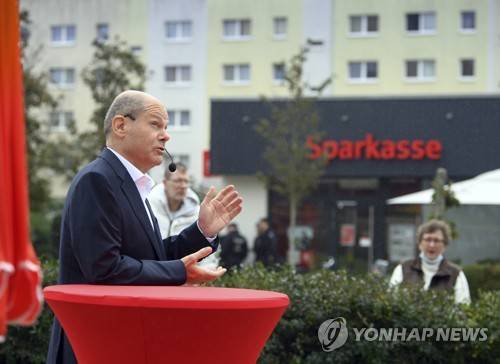 Olaf Scholz, Federal Minister of Finance and SPD candidate for Chancellor, speaks during a campaign event in his constituency 61 on the city square in the residential area Am Schlaatz, Potsdam, Germany, Saturday Sept. 25, 2021, ahead of the German general election on Sunday. (Soeren Stache/dpa via AP) GERMANY OUT