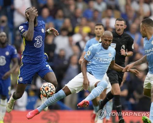 Chelsea's Antonio Rudiger, front left, duels for the ball with Manchester City's Fernandinho, center right, during the English Premier League soccer match between Chelsea and Manchester City at Stamford Bridge Stadium in London, Saturday, Sept. 25, 2021. (AP Photo/Alastair Grant)