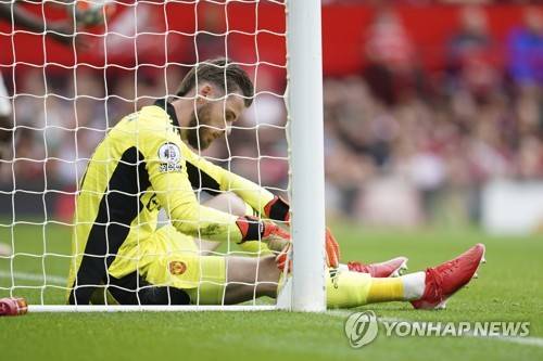 Manchester United's goalkeeper David de Gea reacts after Aston Villa's Kortney Hause scored his side's opening goal during the English Premier League soccer match between Manchester United and Aston Villa at the Old Trafford stadium in Manchester, England, Saturday, Sept 25, 2021. (AP Photo/Jon Super)