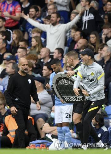 epa09487392 Chelsea manager Thomas Tuchel (R) reacts next to Manchester City manager Pep Guardiola (L) during the English Premier League soccer match between Chelsea FC and Manchester City in London, Britain, 25 September 2021. EPA/Facundo Arrizabalaga EDITORIAL USE ONLY. No use with unauthorized audio, video, data, fixture lists, club/league logos or 'live' services. Online in-match use limited to 120 images, no video emulation. No use in betting, games or single club/league/player publications
