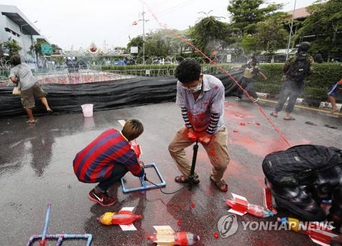 epa09487409 Anti-government protester pumps air into a mock rocket filled with paint as they face anti-riot police officers during a march on the street to the Government House in Bangkok, Thailand, 25 September 2021. Anti-government protesters demonstrate in a street rally calling for the ouster of the prime minister. EPA/NARONG SANGNAK